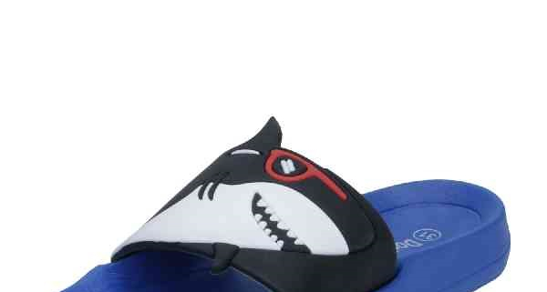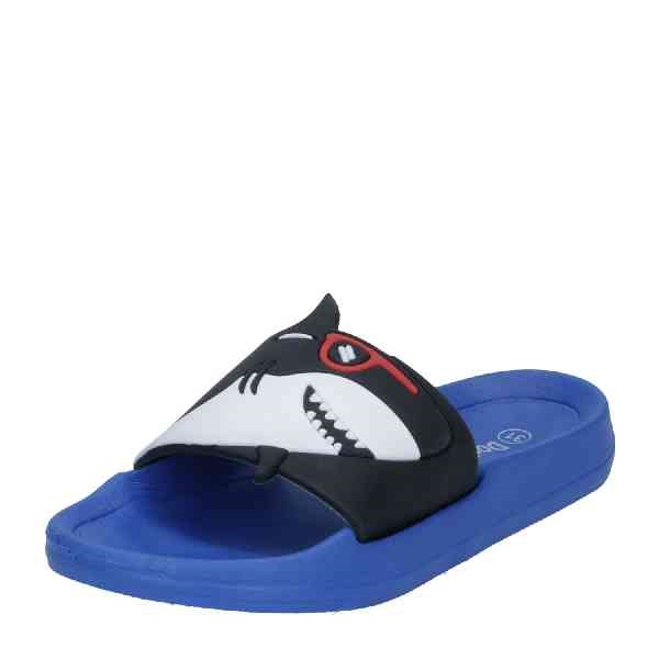 Beschreibung: Badesandalen aus Kunststoff mit blauer Sohle, schwarzen Riemen und Hai-Motiv.