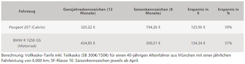 Rund 2,57 Millionen Fahrzeuge mit Saisonkennzeichen waren laut Kraftfahrt-Bundesamt im Jahr 2023 zugelassen. Mit dieser saisonalen Zulassung können Halterinnen und Halter ihren Kfz-Versicherungsbeitrag deutlich senken. Ein 40-jähriger Alleinfahrer aus München zahlt 39 Prozent weniger für die Kfz-Versicherung seines Peugeot 207 Cabrios, wenn er es acht statt zwölf Monate zulässt. Damit entlastet er sein Budget um rund 126 Euro im Jahr. 134 Euro – 31 Prozent – spart er mit der Saisonzulassung seines BMW R 1250 GS-Motorrads.
