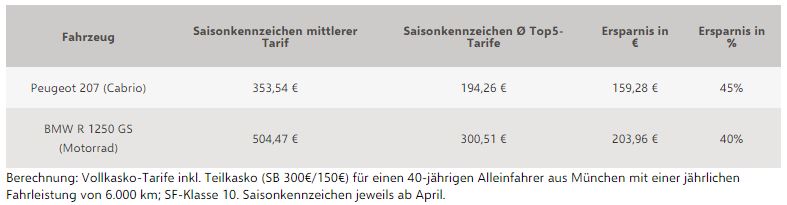 Berechnung: Vollkasko-Tarife inkl. Teilkasko (SB 300€/150€) für einen 40-jährigen Alleinfahrer aus München mit einer jährlichen Fahrleistung von 6.000 km; SF-Klasse 10. Saisonkennzeichen jeweils ab April.