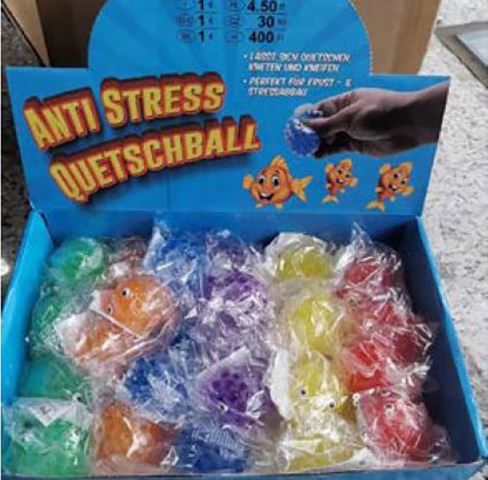 Produktbeschreibung: Stressball in Form eines Fisches, mit grünen Gelbällen im Inneren. Produkt online verkauft.