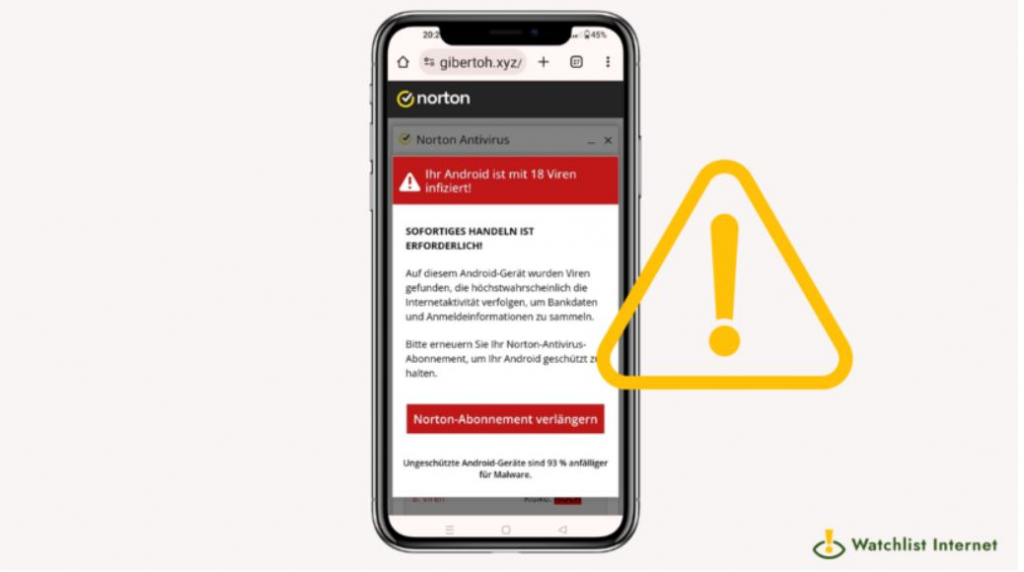 „Ihr Android ist mit 18 Viren infiziert!“ erscheint plötzlich auf Ihrem Handy. Die angebliche Norton-Warnung rät zum sofortigen Handeln. Sie sollen Ihr Norton-Abonnement verlängern. Es handelt sich jedoch um eine betrügerische Warnung. Ignorieren Sie diese Warnung und schließen Sie die Website!