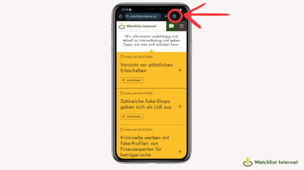 Bleiben Sie ruhig und schließen Sie die gefälschte Warnung. Klicken Sie dazu auf das Symbol mit der umrahmten Zahl neben der Adressleiste. Daraufhin werden alle geöffneten Webseiten angezeigt. Schließen Sie dann die Seite mit der gefälschten Warnung, indem Sie auf das „x“ klicken.